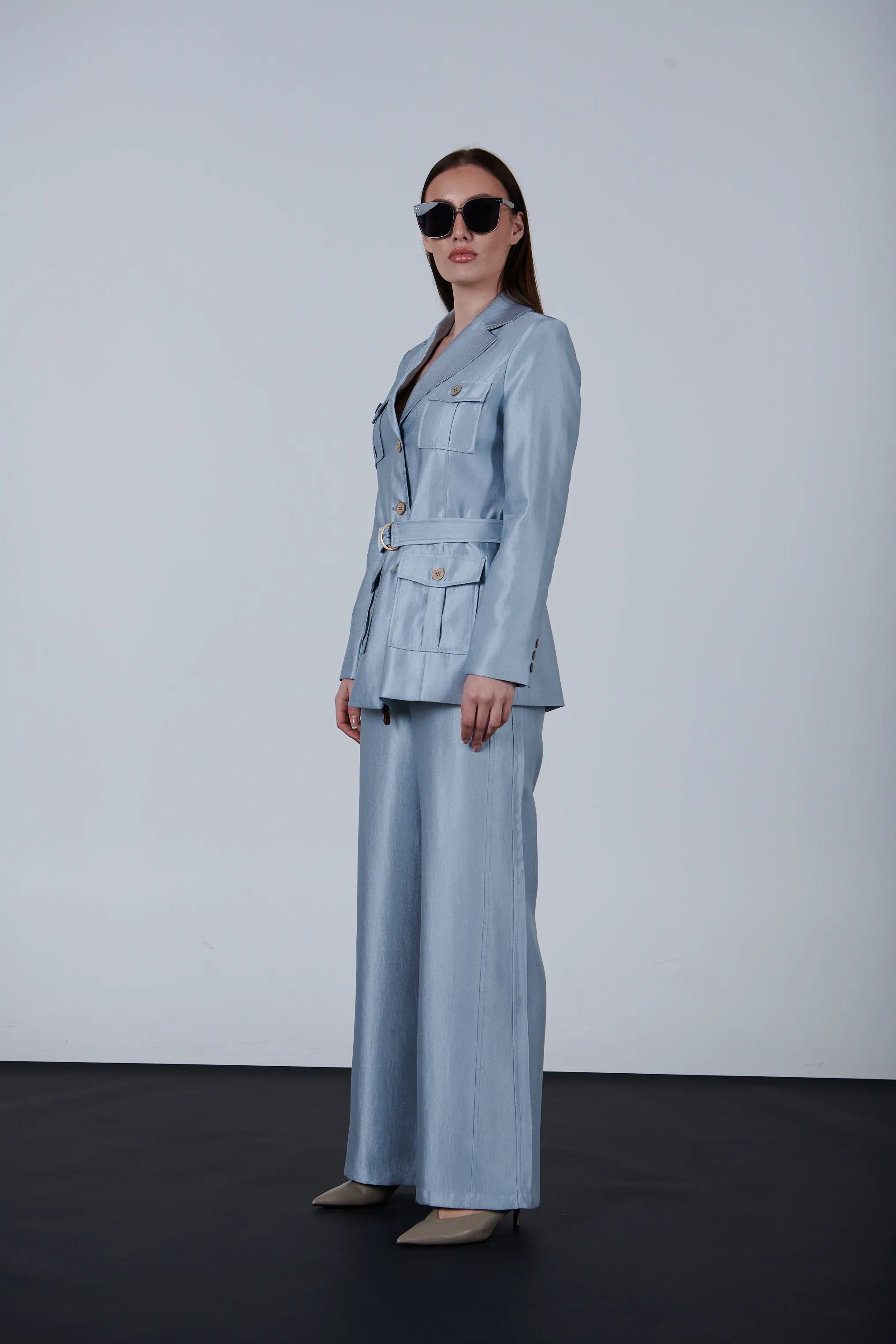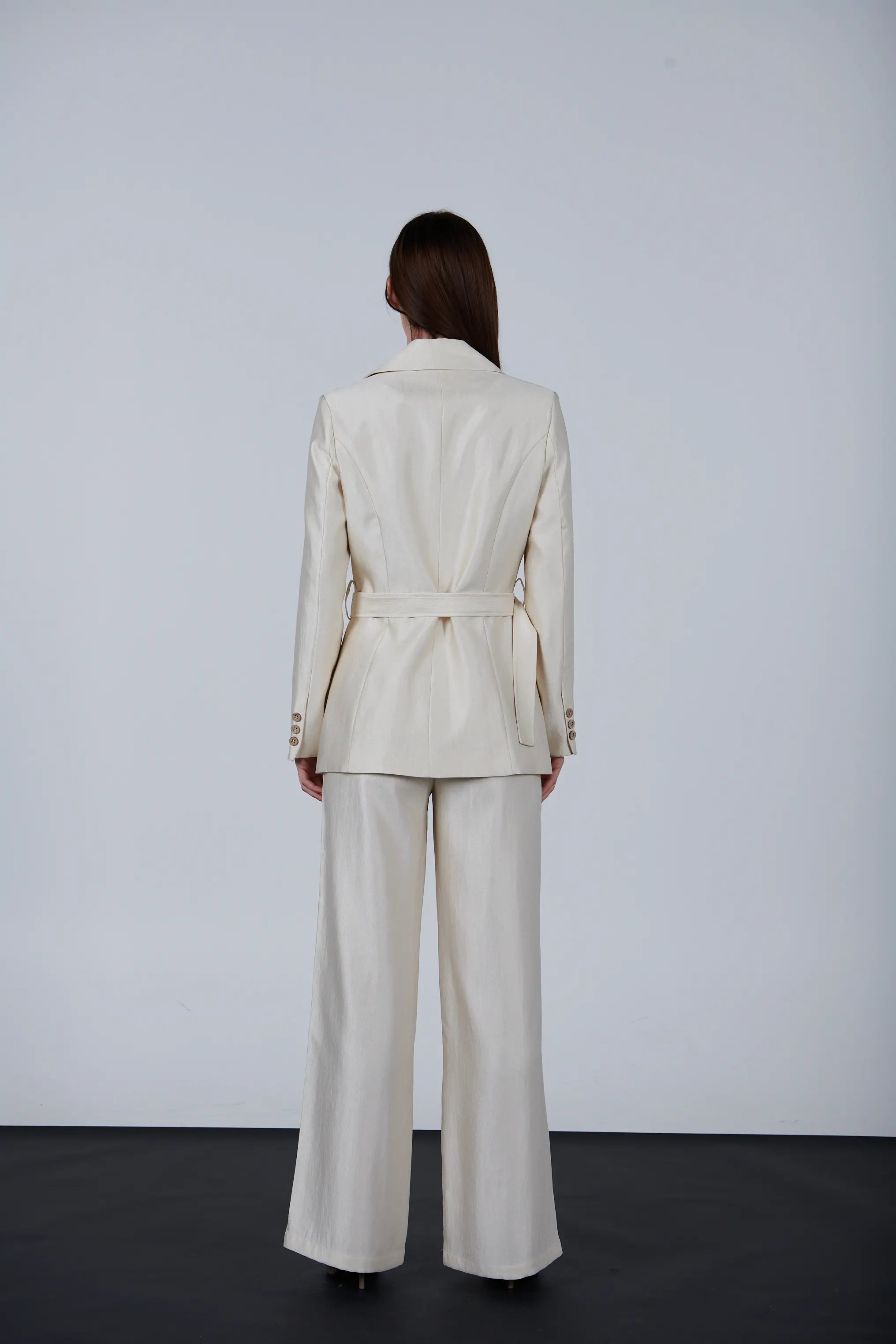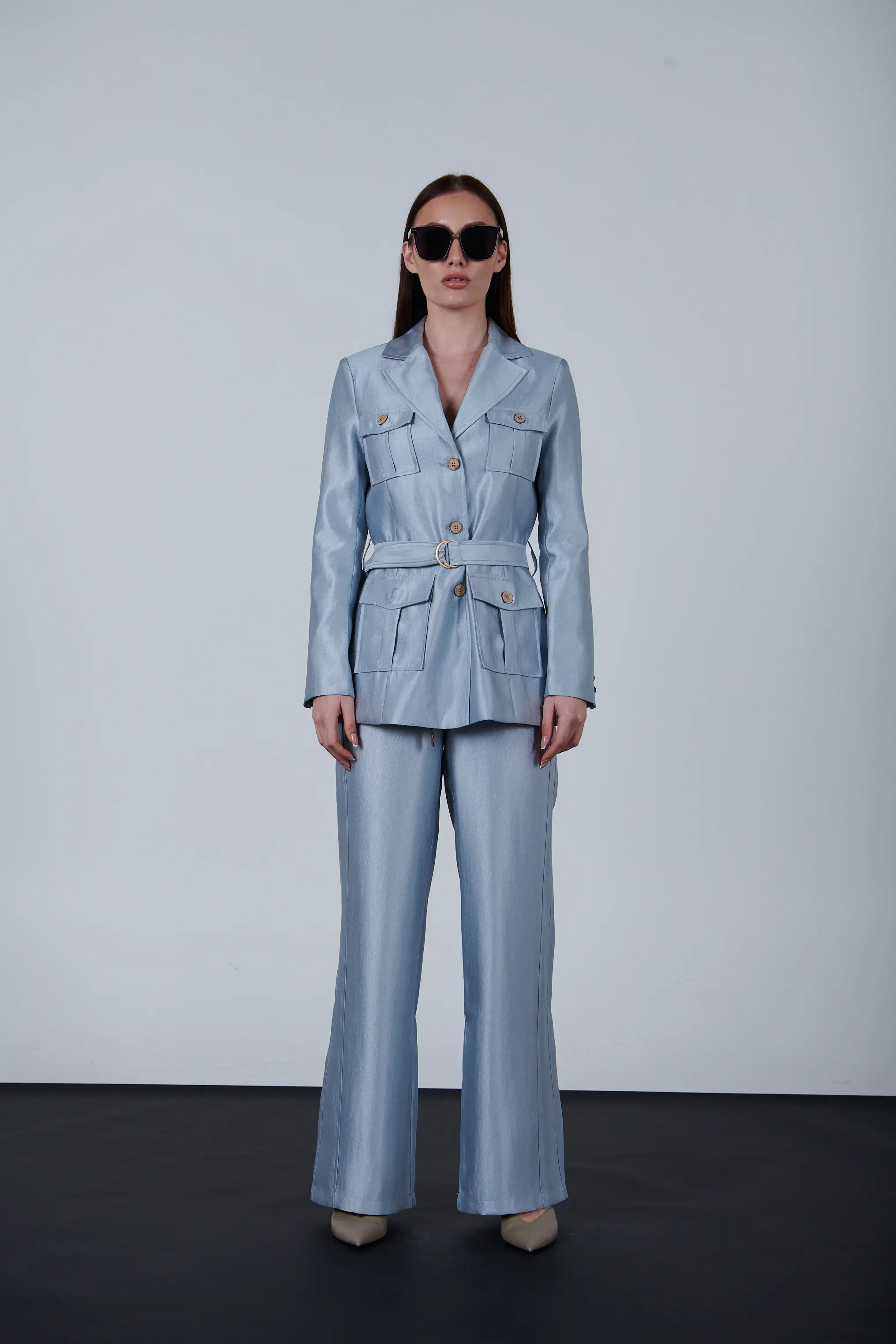 This belted blazer combines style and practicality. It has four front pockets for storage and an adjustable belt for a perfect fit. The tailored design and button details create a polished look, ideal for work or casual wear.