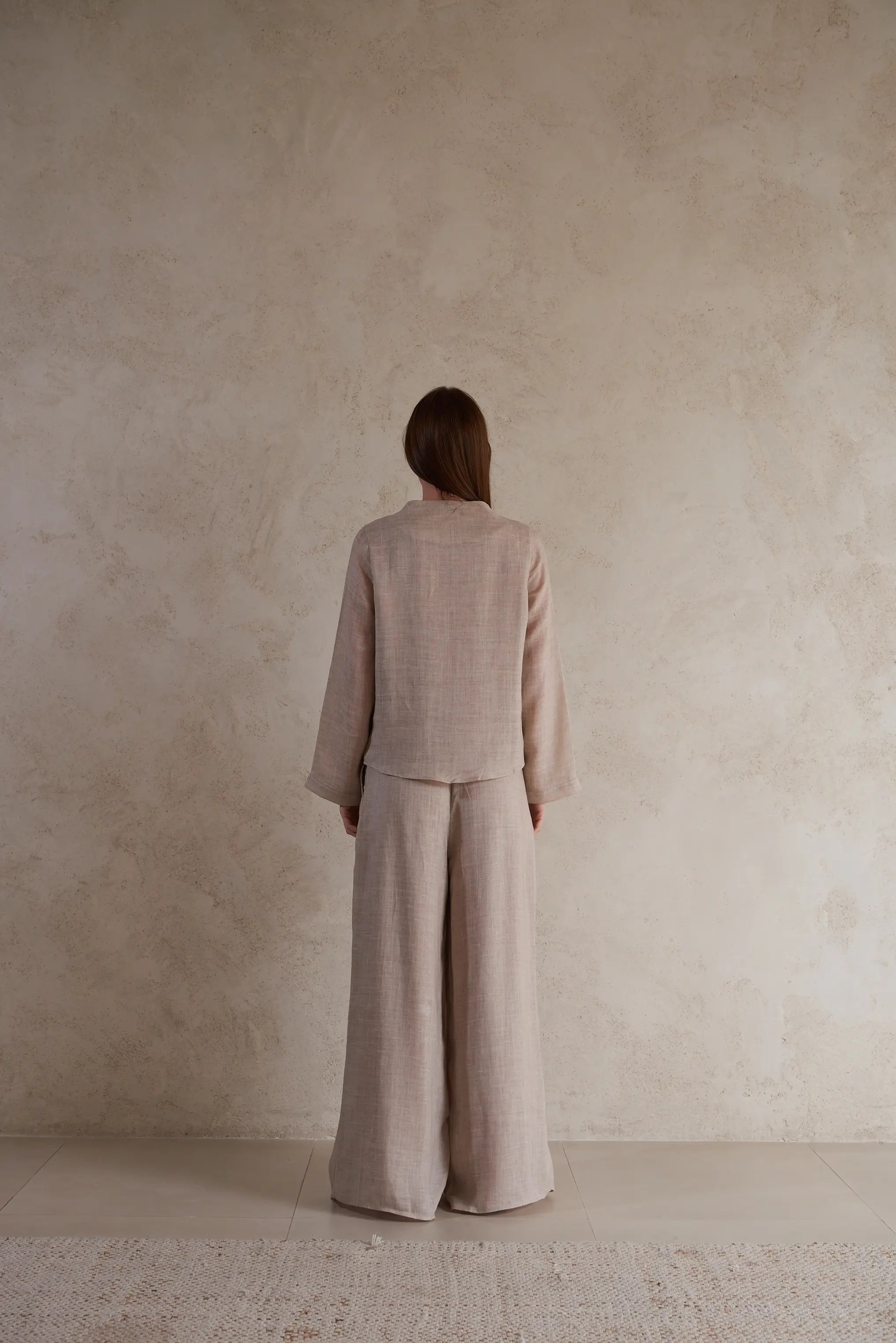 This linen jacket is lightweight, breathable, and comfortable for everyday wear. The long sleeves provide coverage, while the front ties create a clean and modern look. Perfect for layering over different outfits, it adds simple elegance and versatility to your wardrobe.